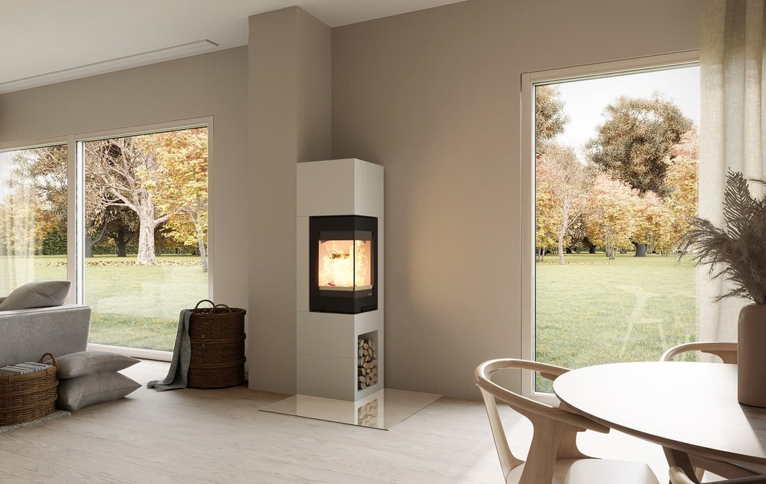 Takan alaosassa on sivussa koristeellinen ja käytännöllinen halkotila. Tuli saadaan näkymään koko huoneeseen tehokkaasti suuren luukun ja korkean palotilan ansiosta.